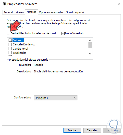 En la nueva ventana desplegada iremos a la pestaña “Mejoras” y allí desmarcamos la casilla “Deshabilitar todos los efectos de sonido”. Damos clic en Aplicar y Aceptar para guardar los cambios.