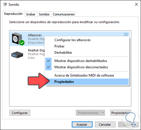 Para deshabilitar esta función vamos al panel de control de sonido integrado en Windows 10 e iremos a la pestaña “Reproducción” y allí damos clic derecho sobre el dispositivo actual y seleccionamos “Propiedades”: