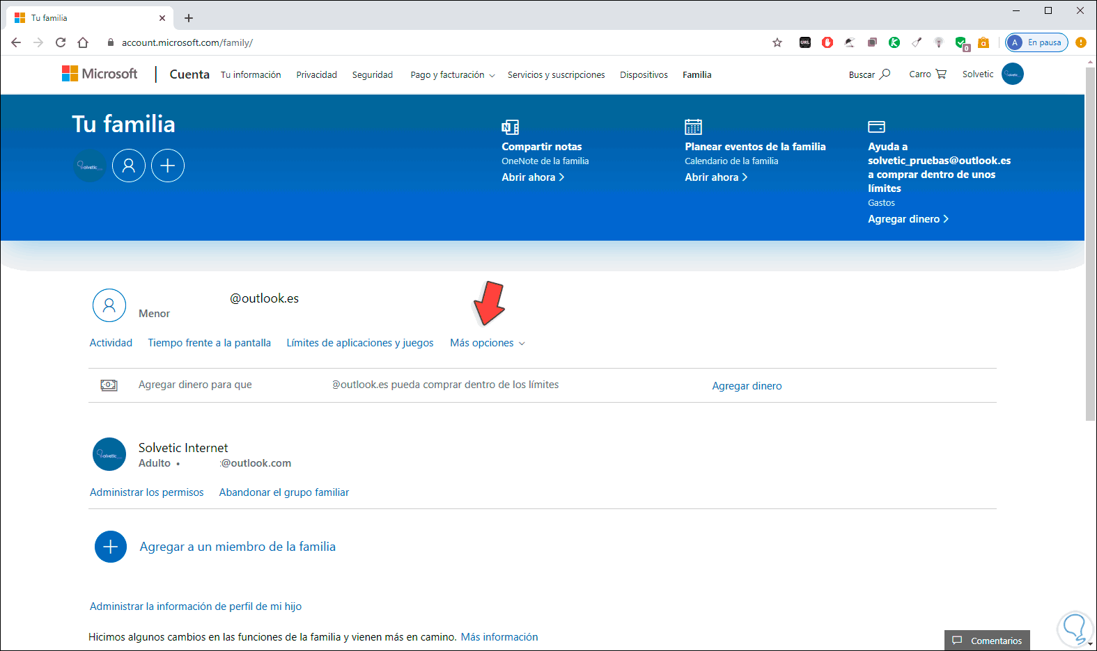 Después de esto accedemos al sitio web de la cuenta de familia de Microsoft donde veremos lo siguiente: