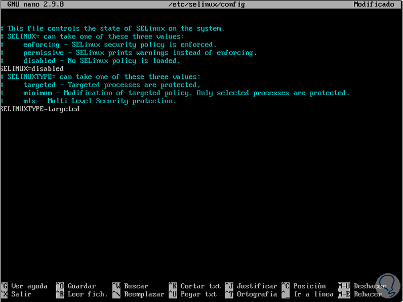 Si el plan es deshabilitar por completo SELinux accedemos de nuevo al archivo: