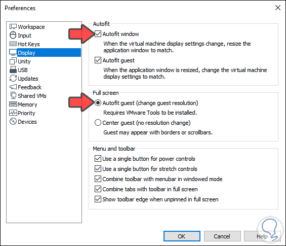 Para usar este método seleccionamos la máquina virtual (la cual debe estar apagada), y vamos al menú “Edit” de VMware y seleccionamos “Preferences”. También podemos usar las teclas Ctrl + P, en la ventana desplegada vamos a la sección “Display” y allí activamos las casillas “Autofit guest” y” Autofit window”: