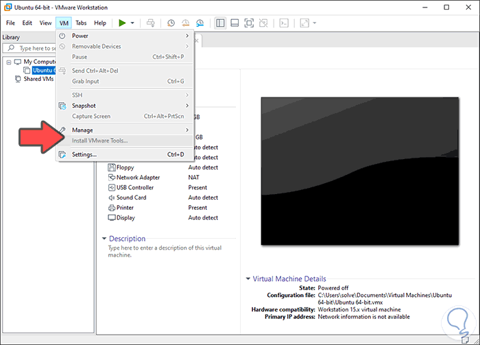 Las VMware Tools son un conjunto de utilidades de VMware con las cuales será posible que todas las opciones de trabajo entre la máquina virtual y el equipo físico sean funcionales (compartir carpetas, usar dos o más monitores, usar USB, etc). Es por ello que debemos instalarlas, y esto se logra de forma simple. Para ello vamos al menú “VM” y en el listado desplegado seleccionar “Install VMware Tools”: