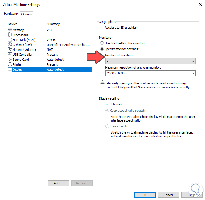 Damos clic en OK para guardar los cambios y ahora damos clic sobre la máquina virtual, o clic en la línea “Edit virtual machine settings”. En la ventana que será desplegada vamos a la sección “Display” y allí activamos la casilla “Specify monitors settings” y en el campo “Number of monitors” ingresamos seleccionamos 2:
