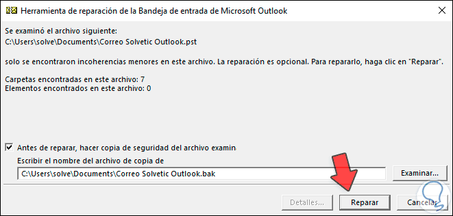 Outlook trabaja con archivos .pst donde se aloja toda la información de los mensajes recibidos y su configuración de carpetas, podemos intentar reparar este archivo para descartar que la causa del error sea el archivo .pst.