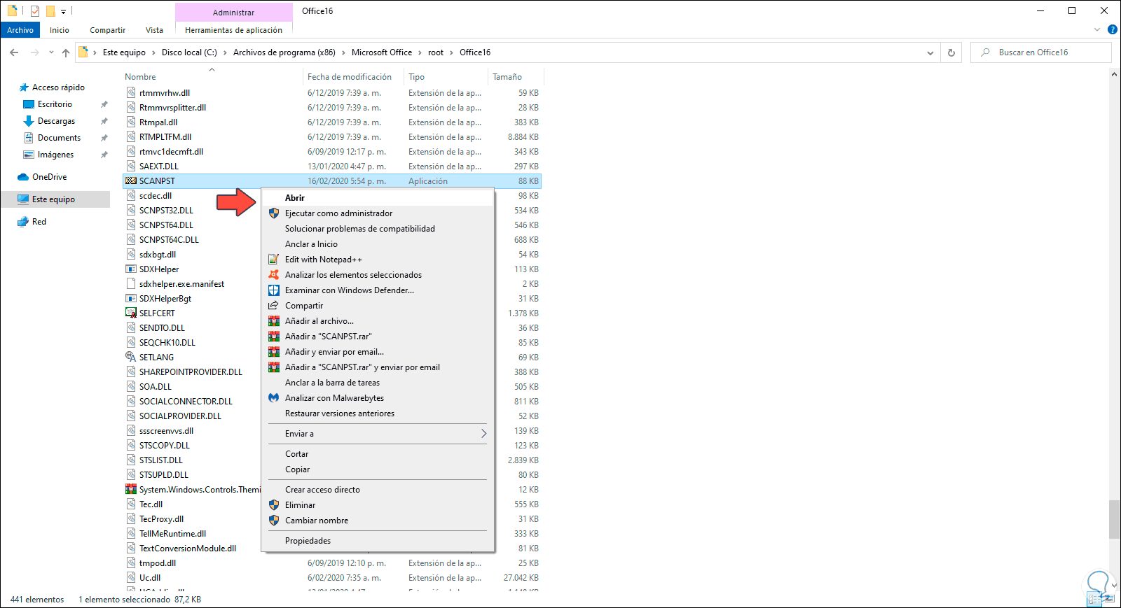 En la ventana desplegada abriremos el archivo SCANPST.EXE: