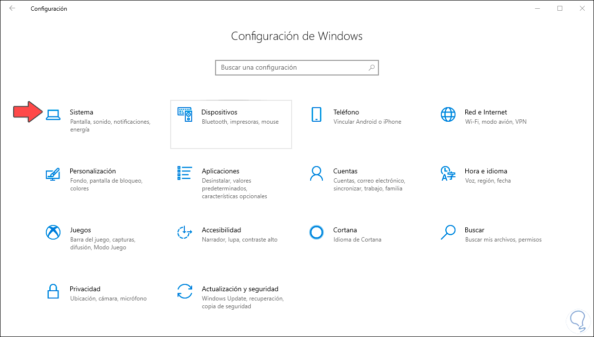 Para lograr este proceso debemos ir al menú Inicio y allí seleccionamos la utilidad Configuración y en la ventana desplegada veremos lo siguiente:
