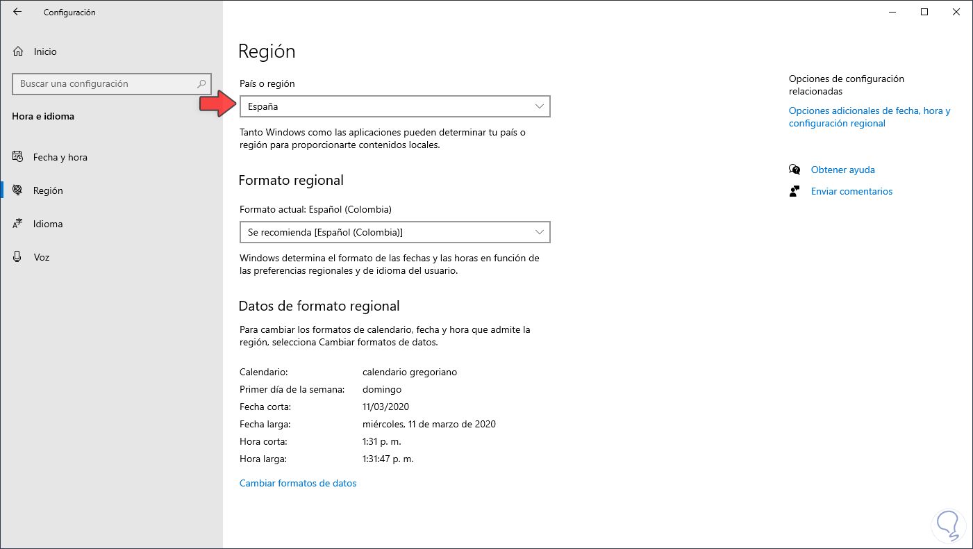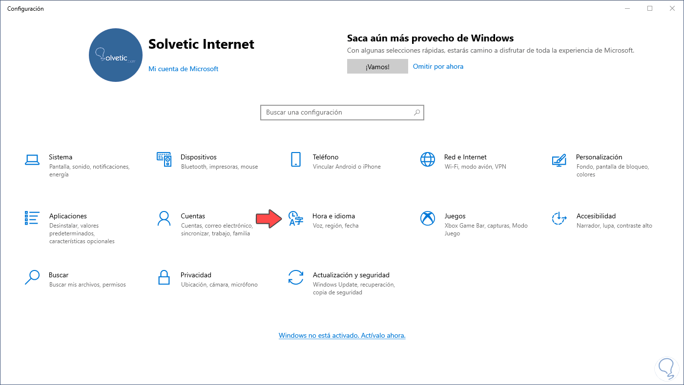 Allí vamos a la categoría “Hora e idioma” y en la siguiente ventana iremos a la sección “Región”: