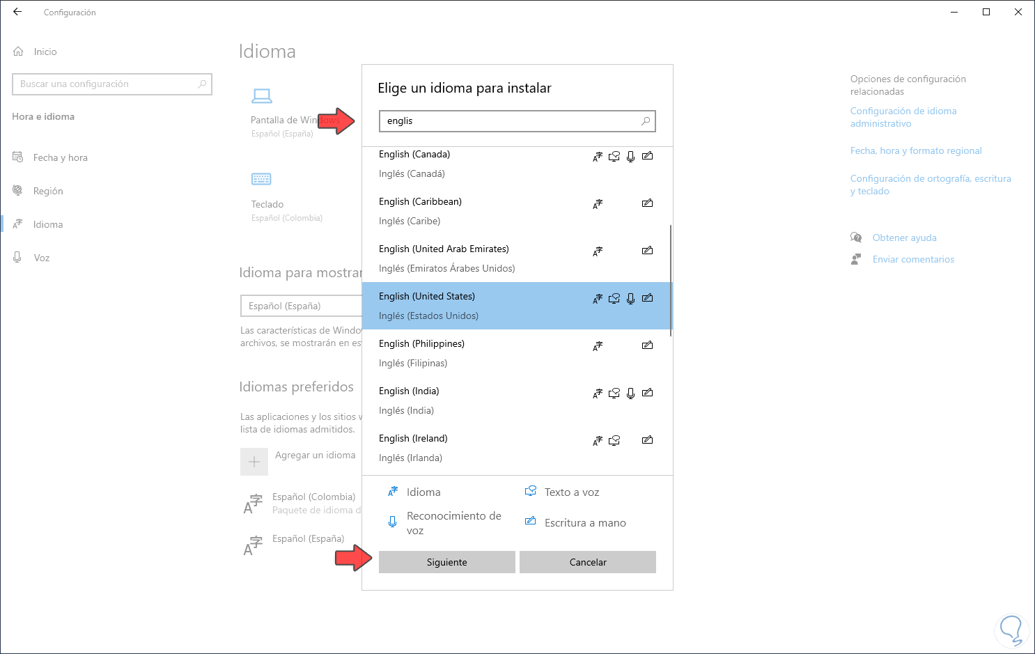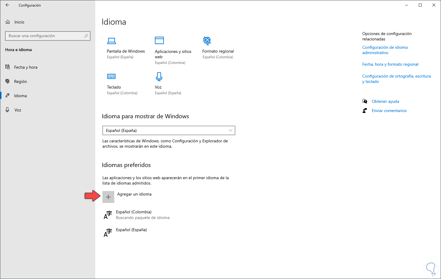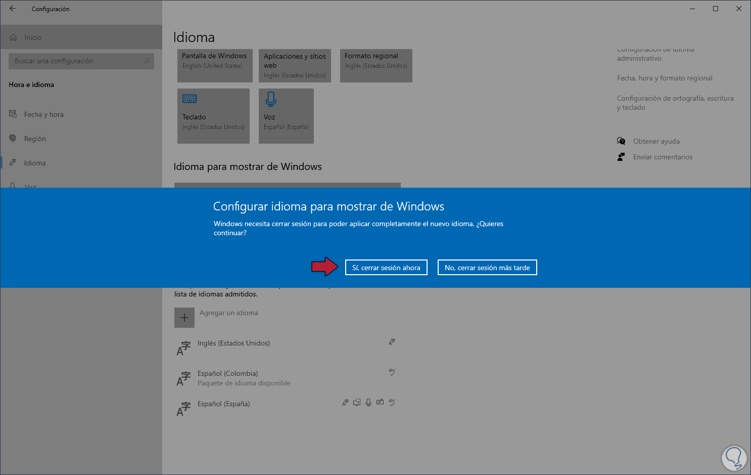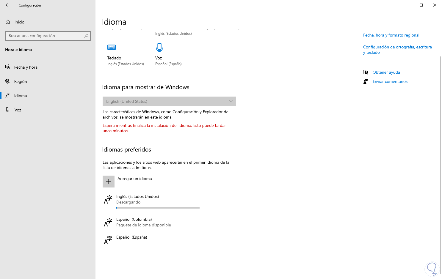 Es un proceso idéntico al anterior ya que como hemos mencionado, Windows 10 se basa en el idioma regional para el despliegue de menús y programas.
