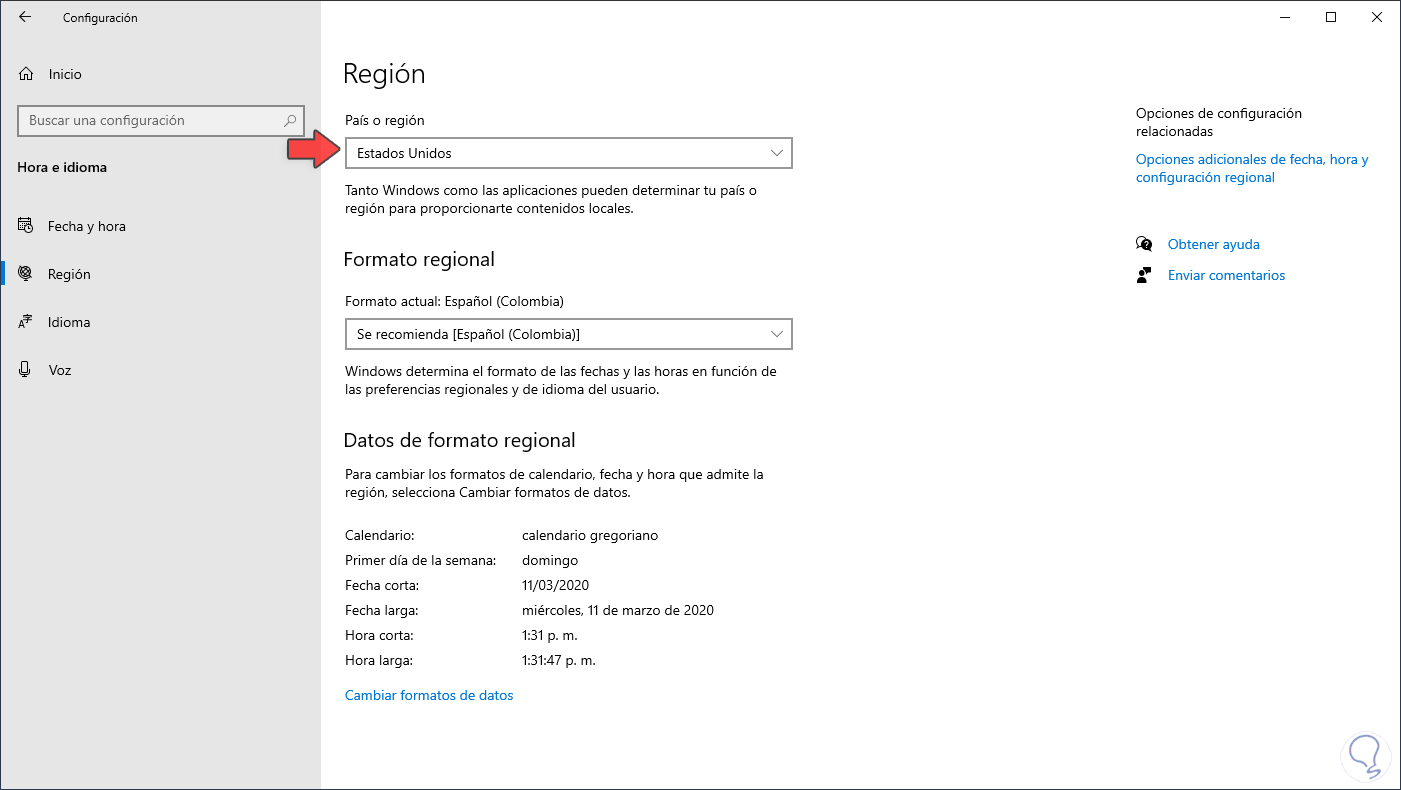 El primer paso a dar será ir al campo “País o región” y allí establecer el país del idioma deseado, en este caso Estados Unidos: