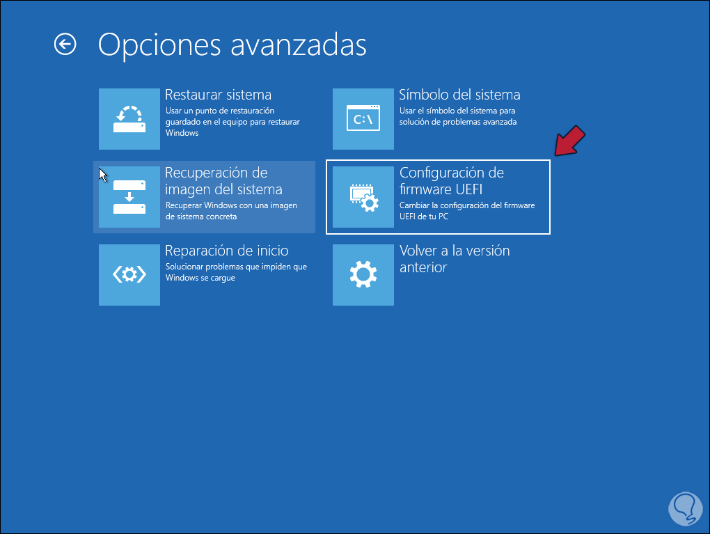 Luego dispondremos de diversas opciones y allí seleccionaremos “Configuración de firmware UEFI”: