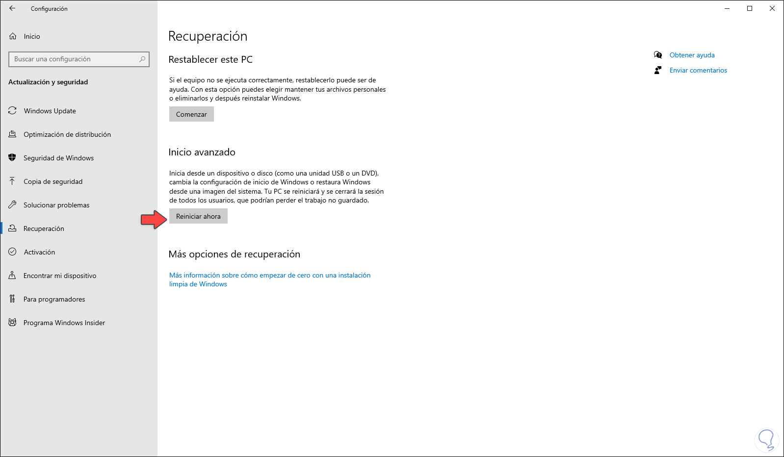 Vamos a la categoría “Actualización y seguridad” y en el sector “Recuperación” damos clic en el botón “Reiniciar ahora” alojado en la sección “Inicio avanzado”: