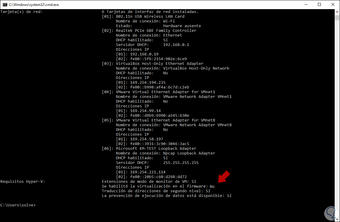 systeminfo.exeEn la parte inferior encontramos la línea “Requisitos Hyper-V” y nos centramos en la línea “Se habilitó la virtualización en el firmware” y allí comprobamos su estado actual. Si el resultado es “No” debes seguir leyendo este tutorial ya que Solvetic te explicará como habilitar la virtualización en tu equipo directamente en la BIOS.
