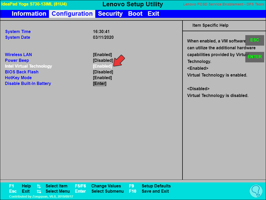 Esto hará que accedamos a la configuración de BIOS y allí iremos, esto en base al fabricante, a la pestaña “Configuration” y allí encontramos la línea “Intel Virtual Technology”: