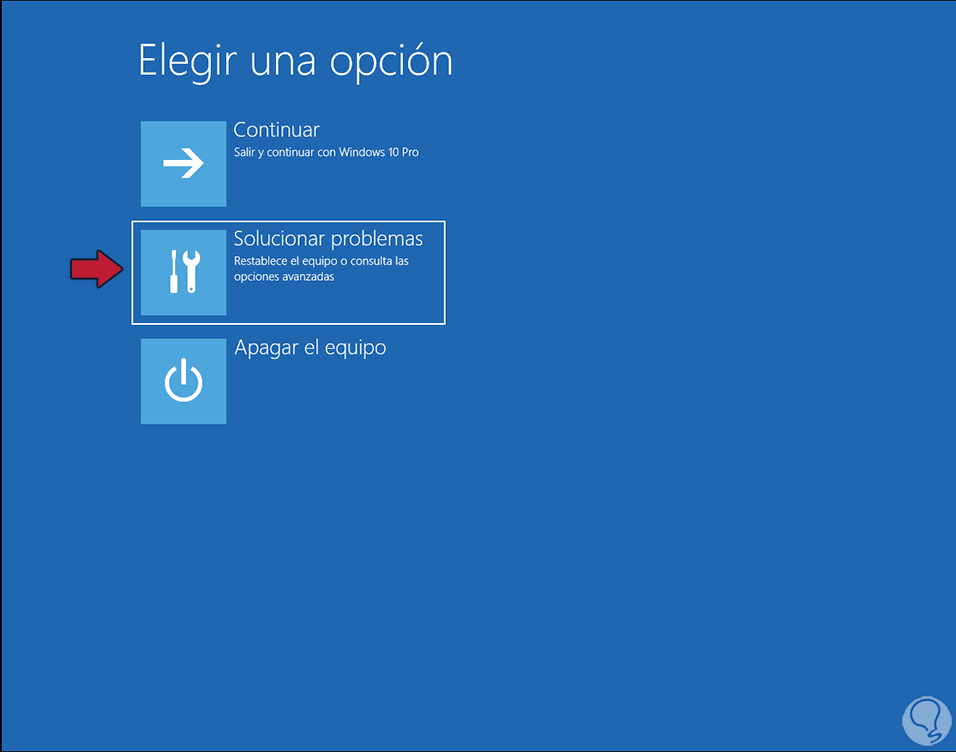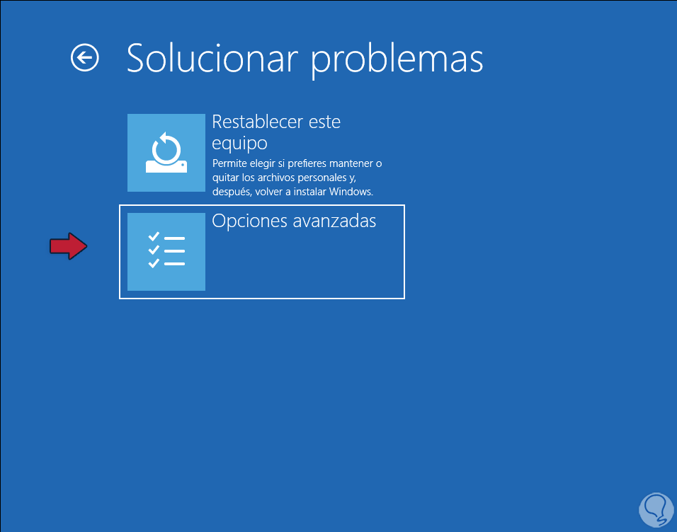 Damos clic sobre “Solucionar problemas” y en la siguiente ventana damos clic sobre “Opciones avanzadas”: