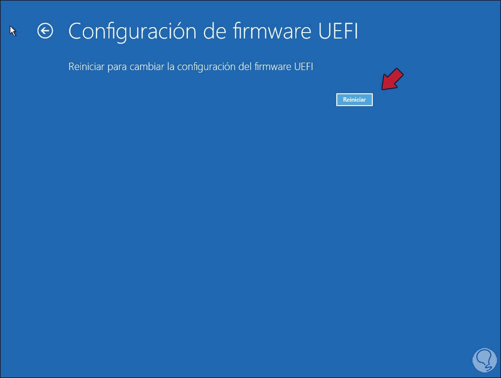Se desplegará la siguiente ventana. Damos clic en “Reiniciar” para acceder a la configuración de UEFI del equipo.