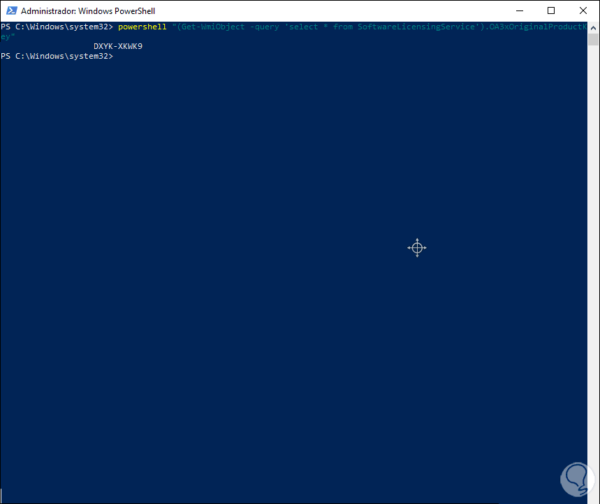 Al igual que el comando anterior el resultado será la clave actual de Windows 10: