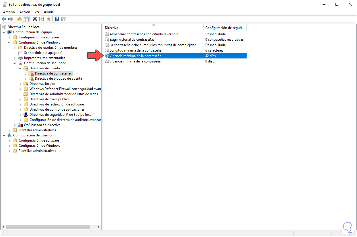 Para hacer que el usuario cambie su contraseña cada cantidad de días debemos seleccionar la política “Vigencia máxima de la contraseña”: