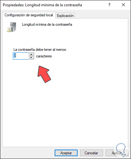 Damos doble clic sobre esta política y en la ventana emergente vamos al campo “La contraseña debe tener al menos” y allí indicamos la cantidad mínima de caracteres. Una vez definido esto damos clic en Aplicar y Aceptar para guardar los cambios.