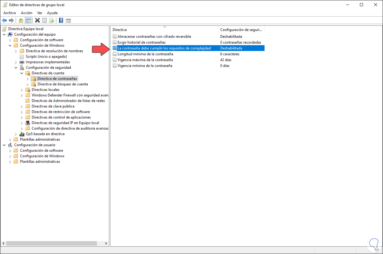 Para añadir seguridad en Windows 10 disponemos de las opciones de usar caracteres especiales en las contraseñas o de modificar las contraseñas cada X días, para esta mejor seguridad seleccionamos la política “La contraseña debe cumplir los requisitos de complejidad”: