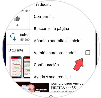 Empezamos a reproducir un vídeo. Veremos que si cambiamos de pestaña el vídeo se parará. Para impedirlo pulsa en los 3 puntos superiores y elige “Versión escritorio”.