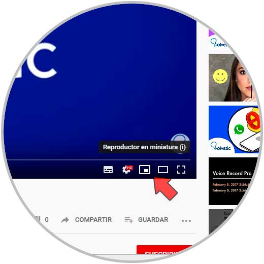 Para esto, reproducimos el video deseado en YouTube y daremos clic sobre el icono “Reproductor en miniatura” o bien podemos usar la tecla i:
