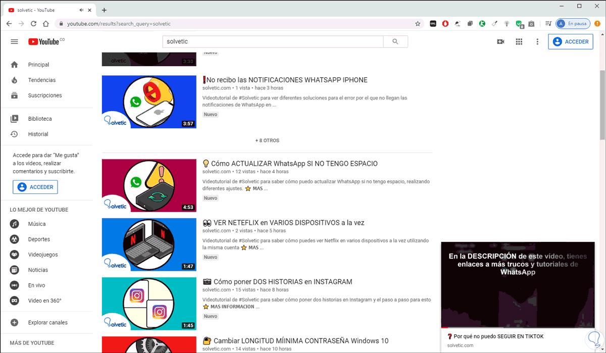 Al pulsar aquí podremos seguir navegando en el contenido y en el extremo inferior derecho visualizar el video actual: