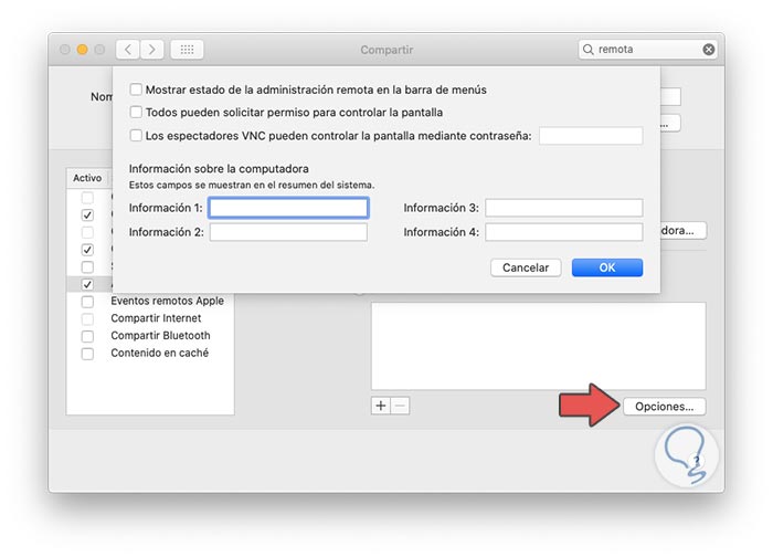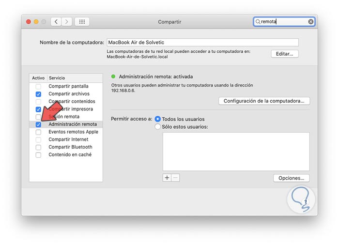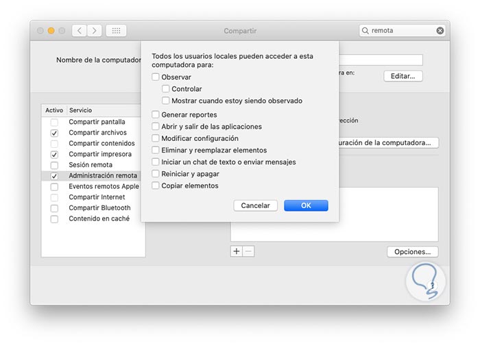 En la ventana de Preferencias del sistema ingresamos “remota” en el buscador y en las opciones disponibles activamos la casilla “Administración remota”: