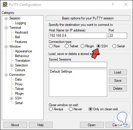 Una vez accedamos a Putty ingresamos la IP de macOS y siempre estará con el puerto 22 y con la casilla SSH activa: