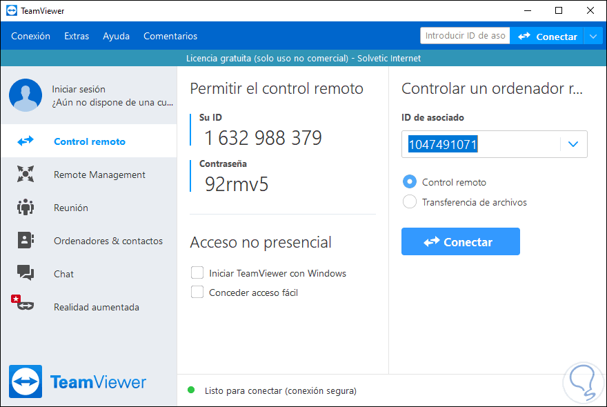 Con esto accederemos al equipo remoto a través de TeamViewer:
