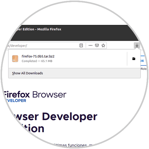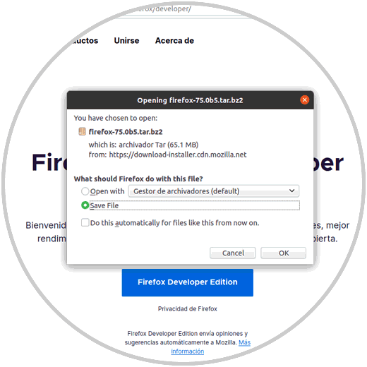 Allí damos clic sobre el botón “Firefox Developer Edition” y se desplegará la siguiente ventana donde debemos guardar el archivo .tar: