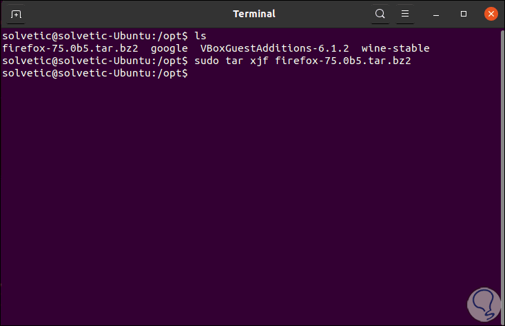 sudo tar xjf firefox-75.0b5.tar.bz2