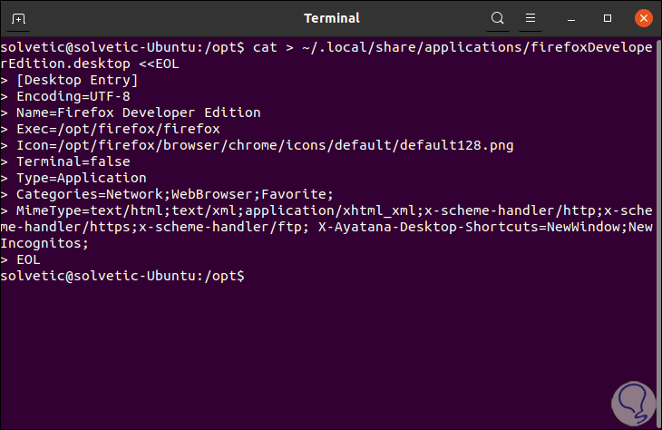 cat > ~/.local/share/applications/firefoxDeveloperEdition.desktop <<EOL [Desktop Entry] Encoding=UTF-8 Name=Firefox Developer Edition Exec=/opt/firefox/firefox Icon=/opt/firefox/browser/chrome/icons/default/default128.png Terminal=false Type=Application Categories=Network;WebBrowser;Favorite; MimeType=text/html;text/xml;application/xhtml_xml;x-scheme-handler/http;x-scheme-handler/https;x-scheme-handler/ftp; X-Ayatana-Desktop-Shortcuts=NewWindow;NewIncognitos; EOL