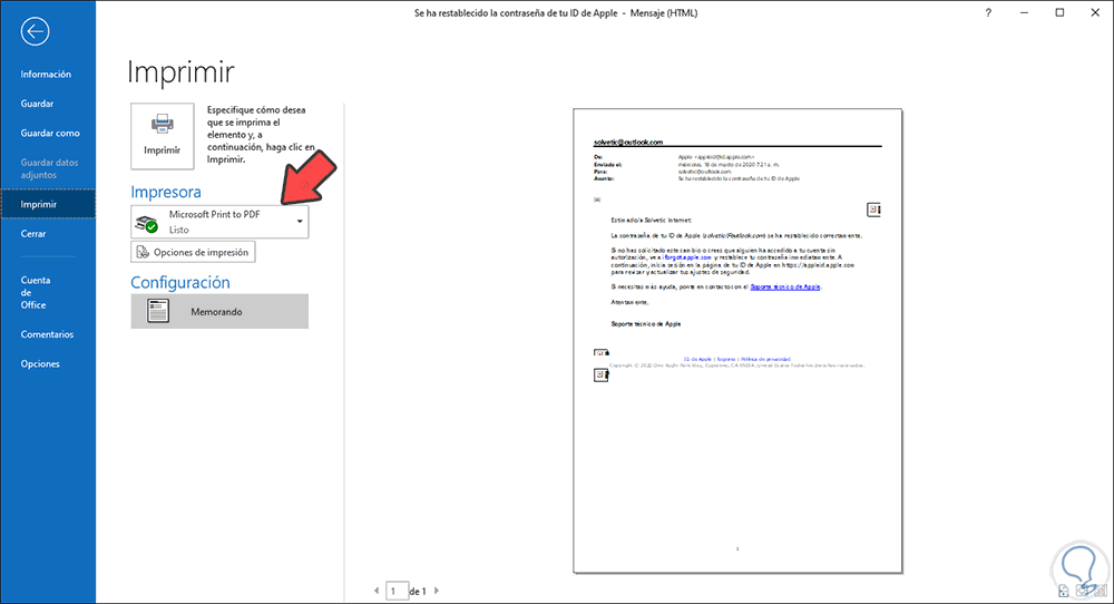 Para el caso de Outlook en Windows 10, abrimos la aplicación, luego abrimos el correo a guardar como PDF y vamos al menú Archivo - Imprimir: