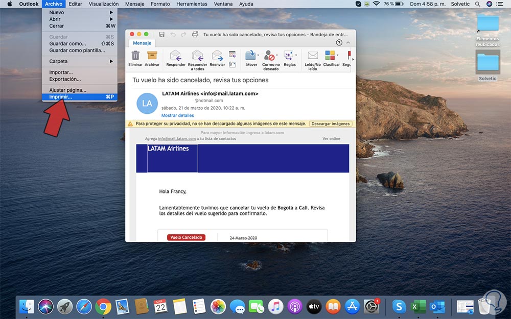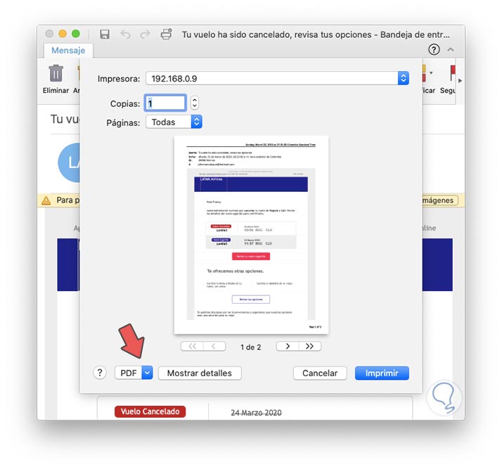 Damos clic en “Imprimir” para definir donde se guardar el mensaje en este formato en macOS.