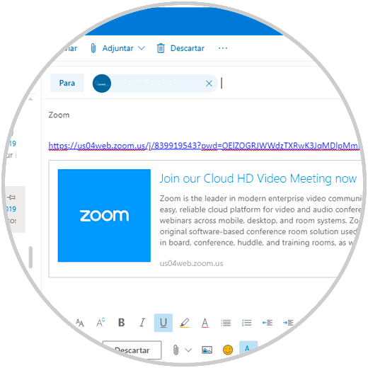 Después de esto estará disponible el mensaje que será enviado a los usuarios de Zoom para que tengan conocimiento de la reunión: