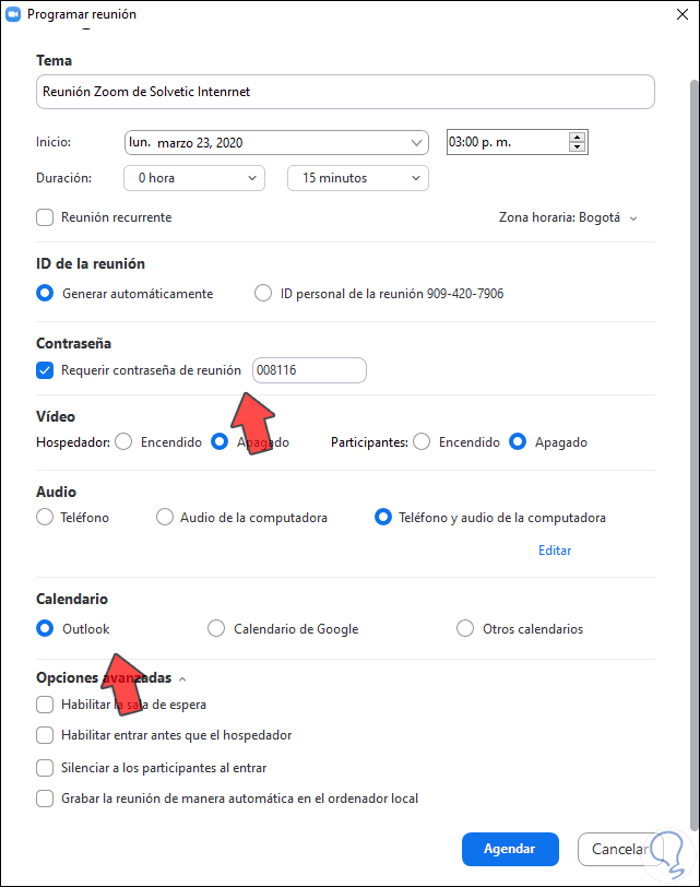 En la sección “Calendario” tenemos la oportunidad de agregar esta reunión al calendario de Outlook, Google o alguno otro que manejemos, para ello debemos activar la casilla necesaria.
