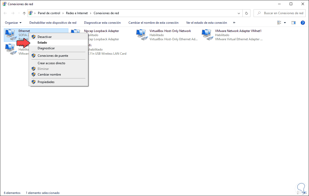 Vamos a la sección “Cambiar configuración del adaptador” y allí damos clic derecho sobre el adaptador actual y seleccionamos “Estado”: