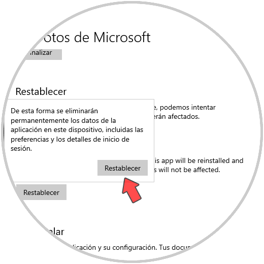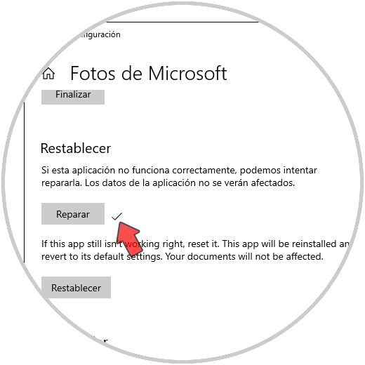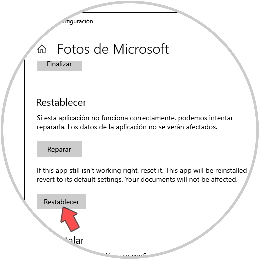 En la siguiente ventana vamos a la parte inferior donde podemos reparar o restablecer la aplicación Fotos: