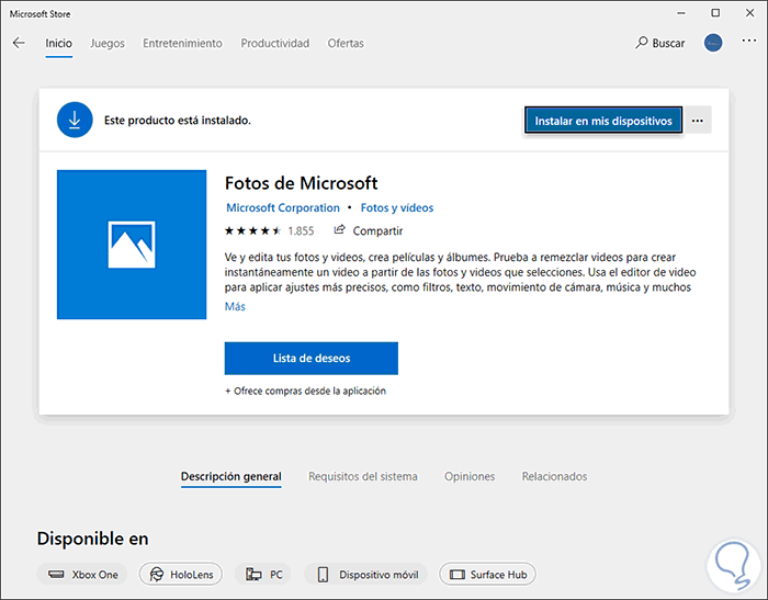 Para ello vamos a la tienda de Windows 10 y allí buscamos la aplicación Fotos de Microsoft. Si llegase a tener alguna actualización veremos un botón superior con la leyenda “Actualizar”.