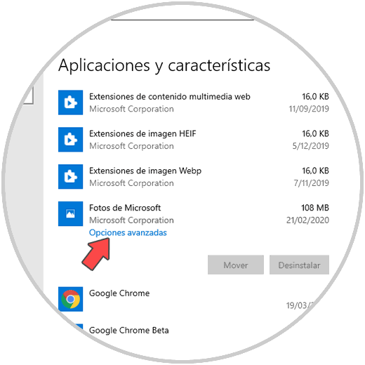 Iremos a la categoría “Aplicaciones” y luego vamos a la sección “Aplicaciones y características”. Allí damos clic sobre la aplicación Fotos de Microsoft y se activará la línea “Opciones avanzadas”: