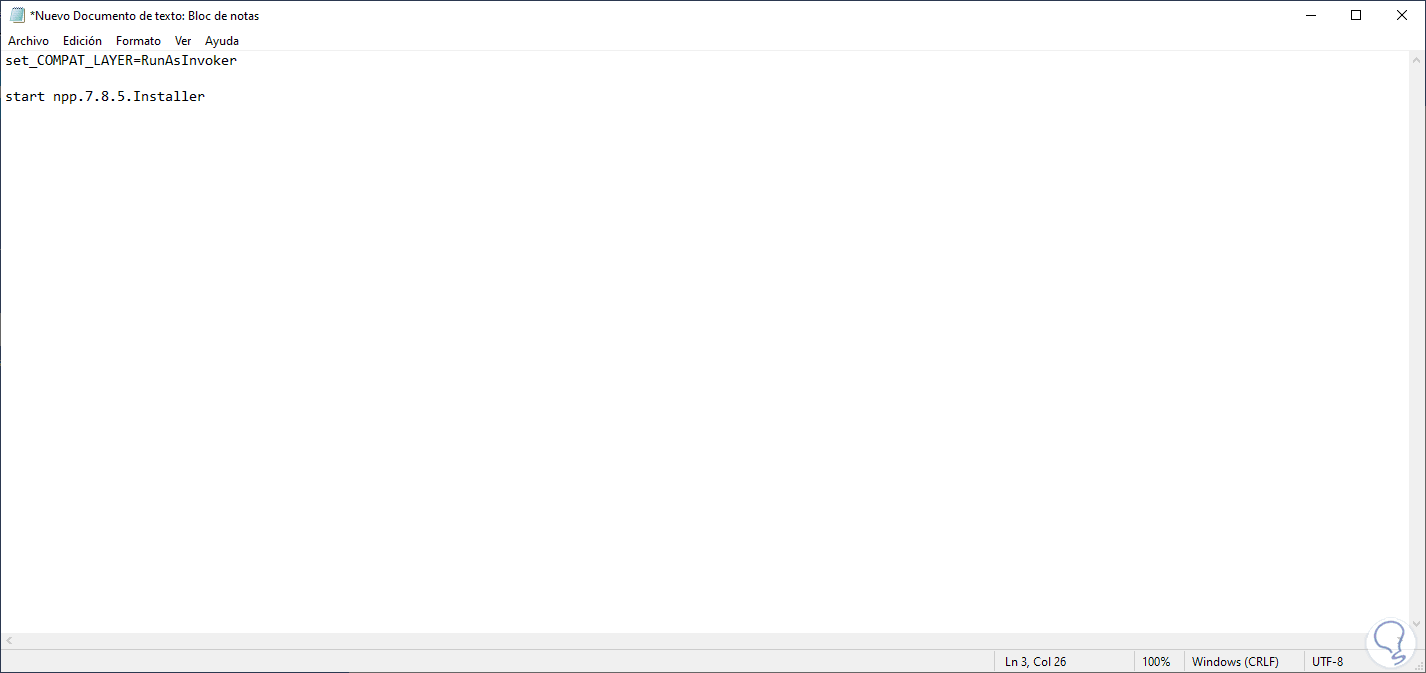 Para ello, vamos a abrir un archivo del bloc de notas y allí ingresaremos lo siguiente: