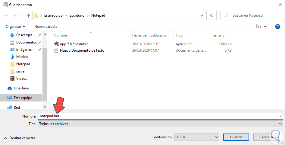 Vamos al menú Archivo – Guardar como y en el campo “Tipo de inicio” seleccionamos “Todos los archivos” y asignamos el nombre seguido de la extensión .bat: