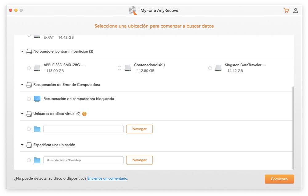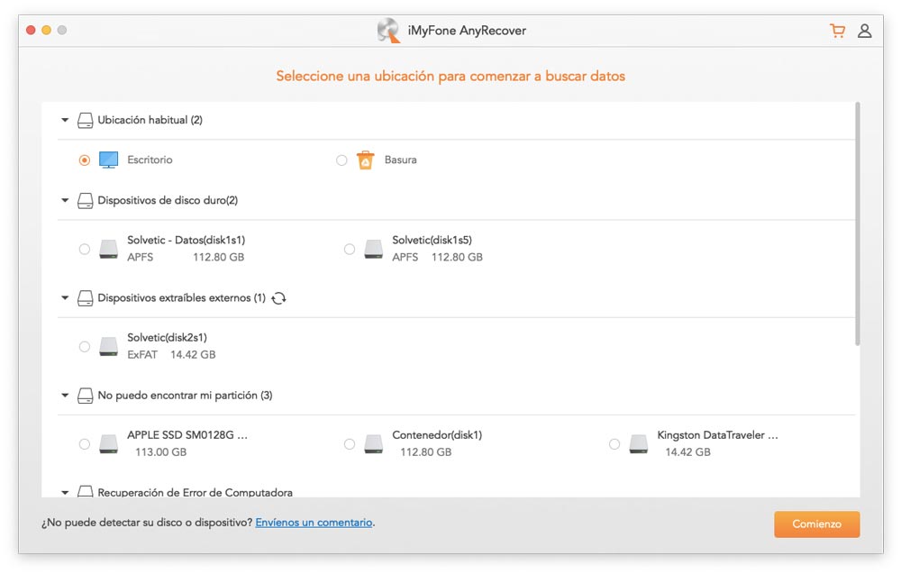 Como podemos ver, allí están disponibles las diferentes opciones para recuperar datos. Podemos seleccionar desde los discos internos de Mac hasta la papelera o elementos del escritorio