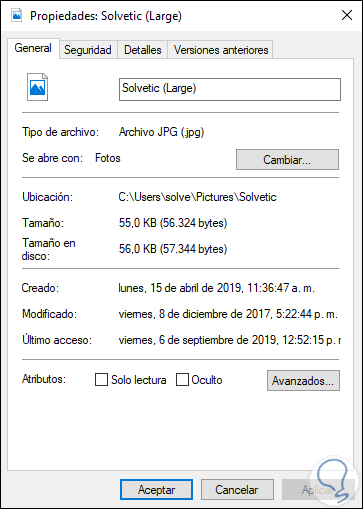 Esto lo comprobamos en las propiedades de la imagen o foto:
