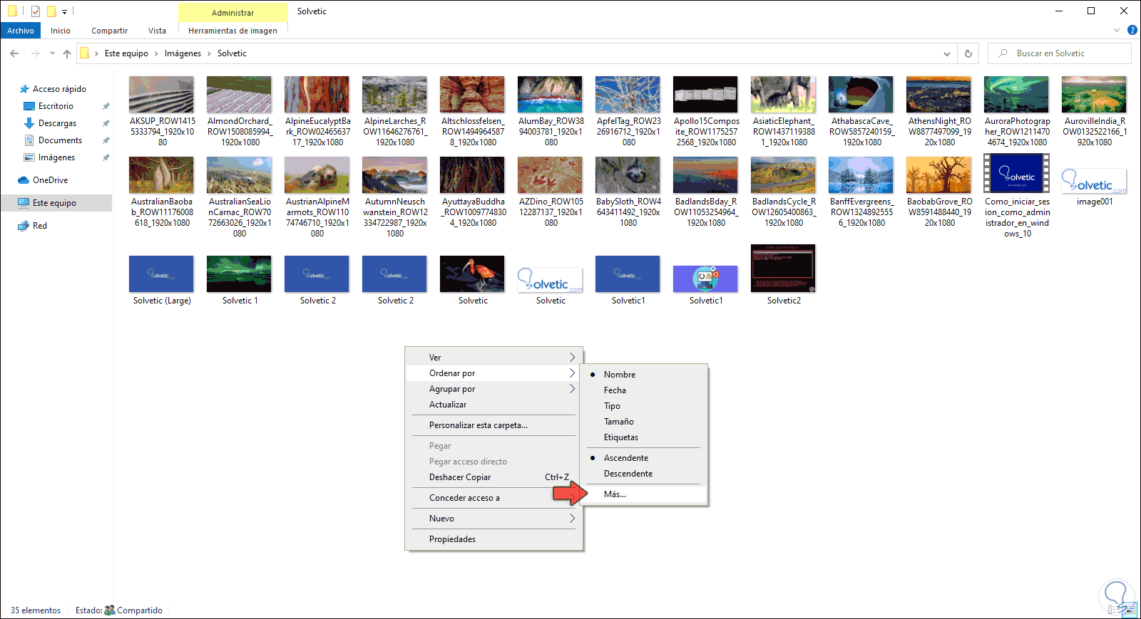 Para realizar este proceso damos clic derecho en algún lugar libre de la carpeta donde están las imágenes y allí seleccionamos la opción “Ordenar por” y luego elegimos “Más”: