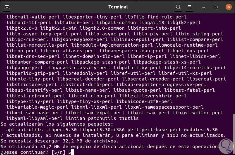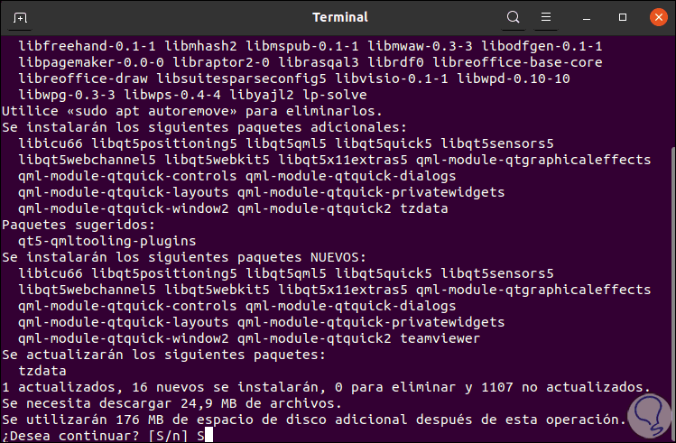 Ingresamos la letra “S” para validar la instalación de Gdebi en Ubuntu 20.04: