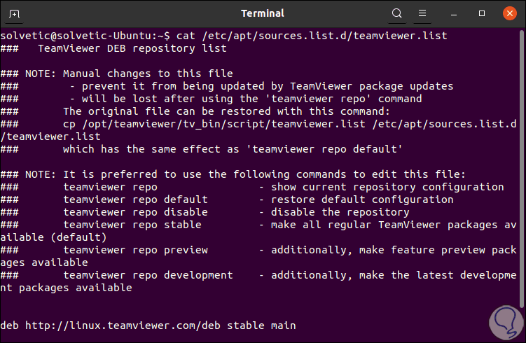 En este proceso de instalación, el repositorio oficial de TeamViewer será añadido a Ubuntu 20.04, con el comando cat será posible visualizar el contenido del archivo en mención.
