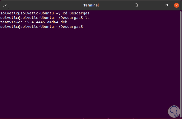 Damos clic en OK y esperamos que el archivo sea descargado, este por defecto estará en la carpeta Descargas así que debemos acceder a la terminal e ir a dicha carpeta usando cd y con “ls” validamos la descarga de TeamViewer en Ubuntu 20.04: