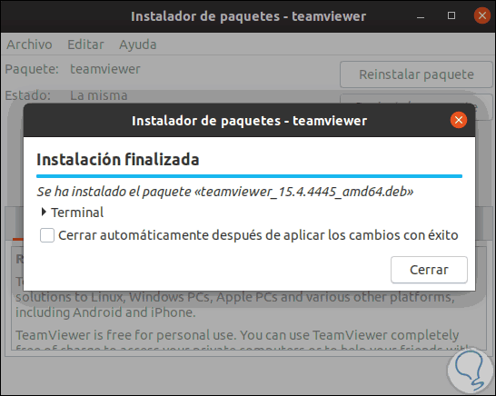 Damos clic en “Cerrar” para salir del asistente y desde la misma utilidad Gdebi podemos reinstalar o desinstalar TeamViewer: