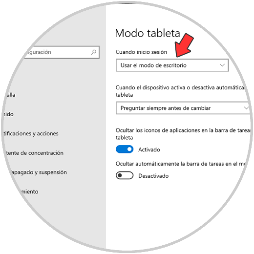 Allí vamos a la categoría “Sistema” y en la parte lateral ubicamos la sección “Modo tableta”, en el campo “Cuando inicio sesión” seleccionamos la opción “Usar el modo de escritorio”. Luego de esto reiniciamos el equipo para aplicar los cambios.